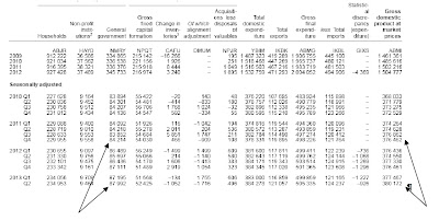 Total government current spending was barely changed from the time the Coalition took office to the end of 2011. (In the ordinary course of events real government spending should rise in line with population growth and in a recession should rise much faster to offset the effects of recession. Unchanged government spending represents a harsh ‘austerity’ stance).