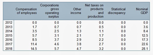 Even this scenario seems unlikely. In a stunning reversal of both pre-recession trends and the entire aim of austerity, the OBR is forecasting is that the lion’s share of the recovery will go to labour, not to capital. Table 2 below shows the distribution of the growth in nominal GDP over the next 5 years (table attached to Chart 3.20 of OBR data).