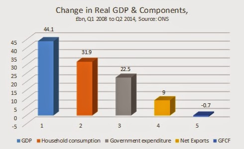 The disparity shown in the different sectors of the economy is a function of the great divergence in the components of GDP. All the main components of GDP have now surpassed their level when the recession began in 2008 except for investment. Household consumption, government expenditure and net exports are all higher, only investment (Gross Fixed Capital Formation, GFCF) remains below its previous peak. The change in GDP and its components in the recession is shown in Fig. 3 below.