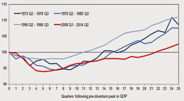 The Irish recession which began in the final quarter of 2007 is the most severe in the history of the state. GDP contracted by 12.1% in a little over two years ending in the 4th quarter of 2009. That slump is not over. The latest data for second quarter of 2014 show that the economy still remains 3.4% below its pre-recession peak. In effect it is likely to take 5 years or more simply to recover the output that was lost in in the slump.