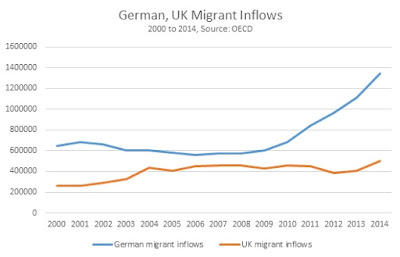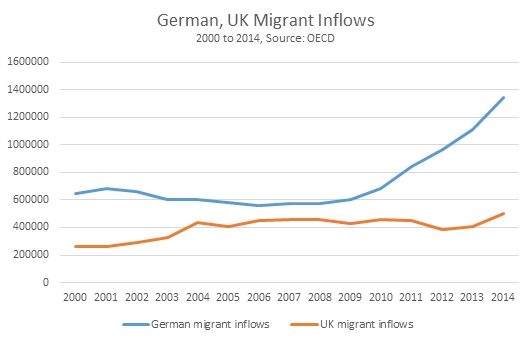 In Chart 2 below the total level of migration to the UK and to Germany from 2000 to 2014. It should be noted that over the period 2007 to 2015 German real wages rose by 13.9% while UK real wages fell by 10.4%, as noted in Chart 1 above.