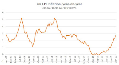 Chart 1 below shows the recent acceleration of the inflation rate as measured by the CPI, up to 2.7% from a year ago in April. Other measures are worse. The RPI, which the ONS has replaced with the CPI shows the inflation rate at 3.5%.