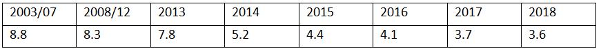 This is far preferable and more effective than austerity. But this is not sustainable over the long-term. The boost to Consumption has not been supported by rising incomes and wages. Instead, Eurostat reports that the household savings ratio has slumped. The trend in Portuguese household saving is shown in Table 1 below, along with Eurostat forecasts for 2017 and 2018. (For reference, Eurostat forecasts the UK household savings rate will fall to 3.7% in 2018, versus an EU average of 9.9%).