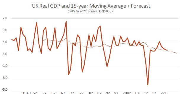 1.2% average annual growth is exceptionally low. It is half of what had often previously been cited as the trend growth rate of the UK economy of 2.5%. If these forecasts are approximately accurate, they will have severe negative consequences for living standards and for public finances and public services for many years to come.