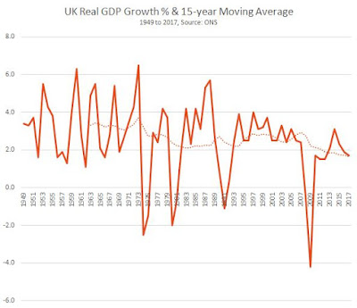 Over the medium-term, this will be the slowest growth rate of any period in the modern era. Chart 2 below shows the growth rate of UK real GDP from 1949 to 2017, plus the 15-year moving average. Using a 15-year moving average has the effect of removing the short-term fluctuations of the business cycle. To date the slowest growth rate on this measure of the 15-year moving average is the current one. The average growth rate over the 15 years to 2017 is just 1.7%.