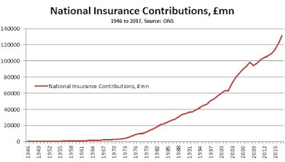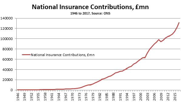 The most glaring example of the nonsensical ideas designed to build a cross-party consensus is the notion of ‘hypothecating’ or ring-fencing National Insurance Contributions (NICs) to pay for the NHS (pdf). Almost all streams of government revenue as sensitive to the business cycle, NICs included. As Chart 1 below shows, revenues from NICs do not climb steadily but are interrupted by occasional sharp downturns coinciding with recessions.